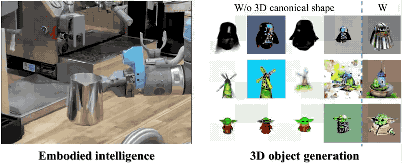 在三维数据对齐方面,团队设计了一种仅需单个先验即可实现同类物体对齐的框架,并构建了当前类别覆盖最广的规范化 3D 数据集,为三维形状生成提供了数据基础。