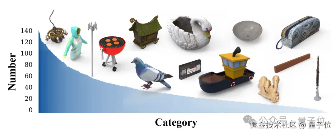 △长尾分布问题:对 Objaverse-LVIS 类别物体数量统计