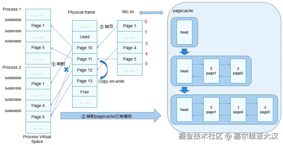 程序执行时,虚拟内存区间若无具体的物理内存做映射,系统将触发缺页中断,将elf文件内容读入物理内存,并将该内存块加入pagecache。
