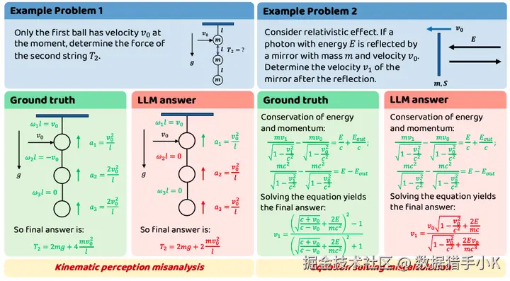 示例问题及错误。这些错误来自 DeepSeek-R1 生成的解答。这里我们展示了主要的参数和物理过程。关于完整的问题文本,请参阅附录D。