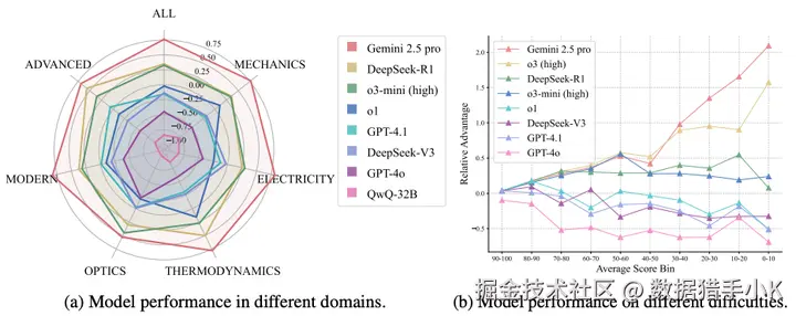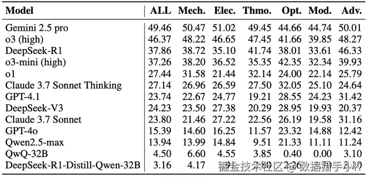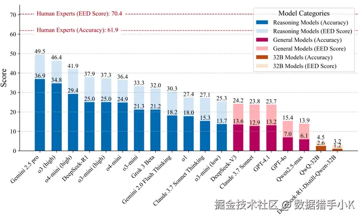 在 PHYBench 上的基准测试结果显示,即使是最先进的推理模型 Gemini 2.5 Pro,其准确率也仅为 36.9%,远低于人类专家的 61.9%。