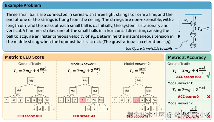展示了一个来自PHYBench的示例问题,用于评估模型性能。图中使用了两个主要指标:表达式编辑距离(EED)得分和准确性。