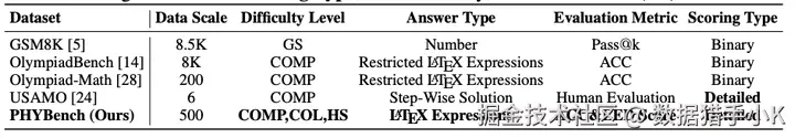 PHYBench与其他推理基准的比较。对于难度等级,COMP:奥林匹克竞赛级别;COL:大学级别;GS:小学;ES:小学;HS:高中