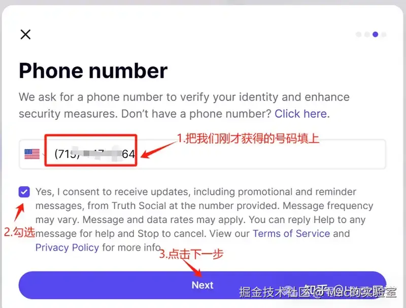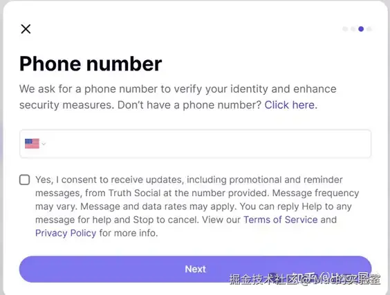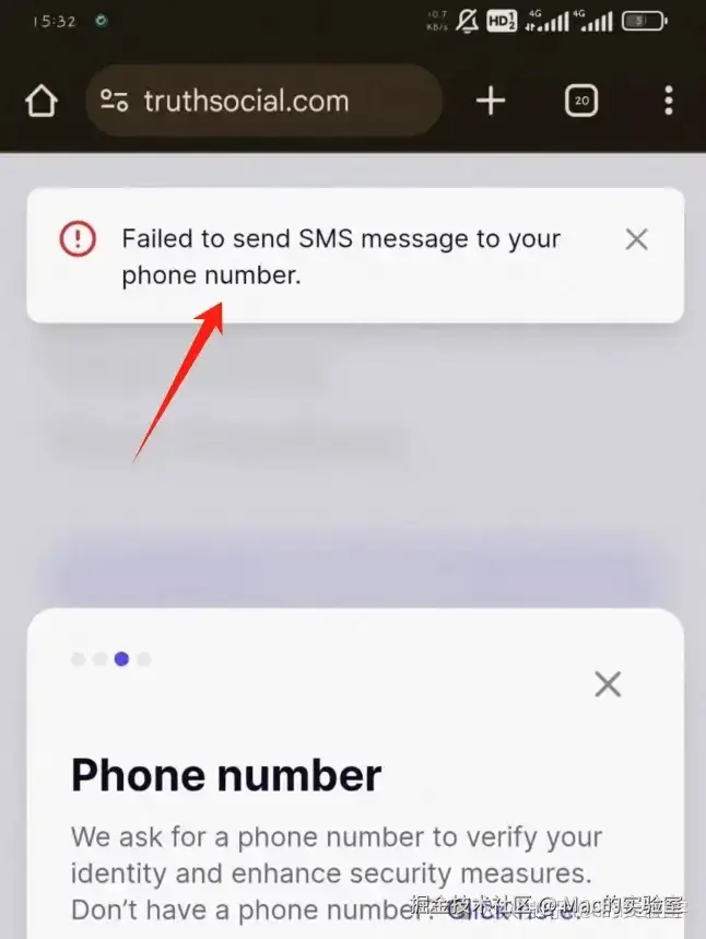 Truth Social对手机号的要求不低,对号码很挑剔,使用接码服务,有可能提示:Unable to proceed with the phone number,这是号码的问题,比如我使得马来西亚的号码就是这个提示。