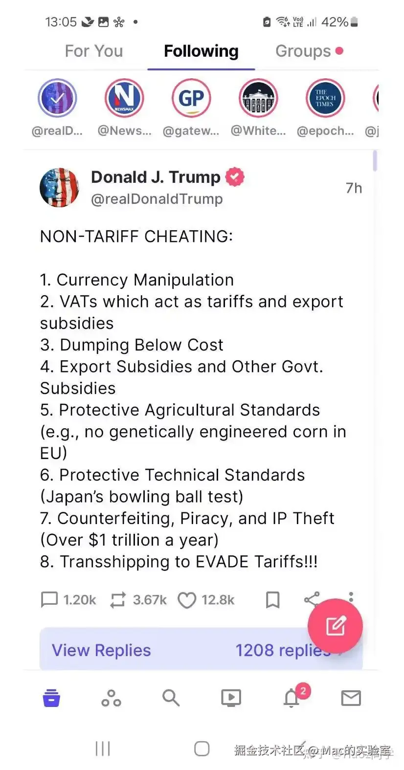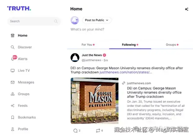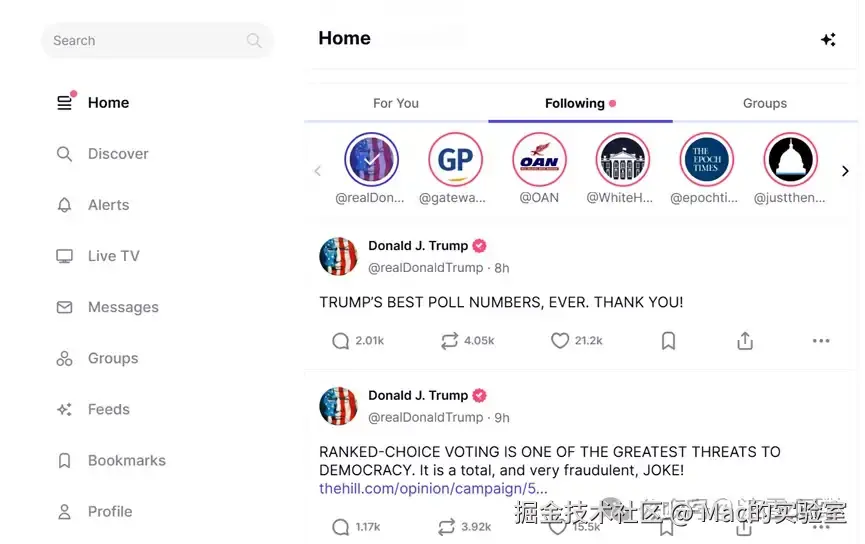那么看到这里肯定有小伙们想说,这里和推(X)没区别啊,是啊,就像我们某博啊,某音啊、某书啊、某圈啊等、只要有关注这个UP主和有这个人的好友我们刷到其动态是必然,可是如果我们想知道懂王第一手实时消息,真的只有这个他自主创建的朋友圈“真相”truthsocial.即使今天我们有关注他的推,可是只有这里是实时的。