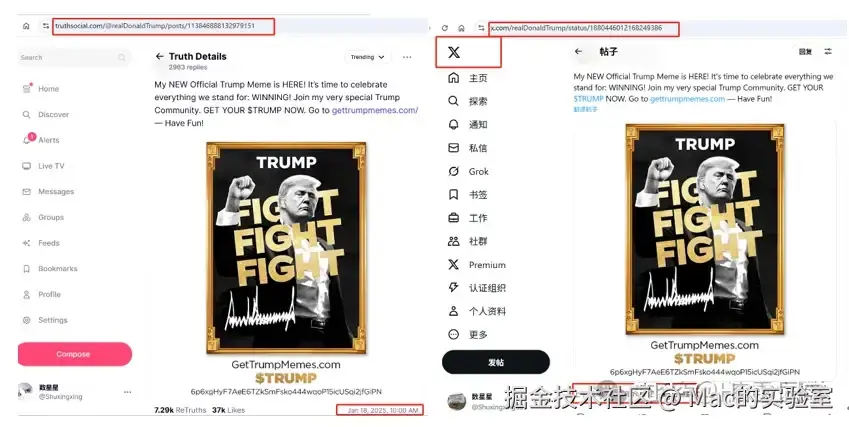 比如我们拿当时加密市场“名噪一时”的trump这个来说,当时懂王是第一时间发布在他的“真相”(图左一)随后推上X平台转发(图右一)