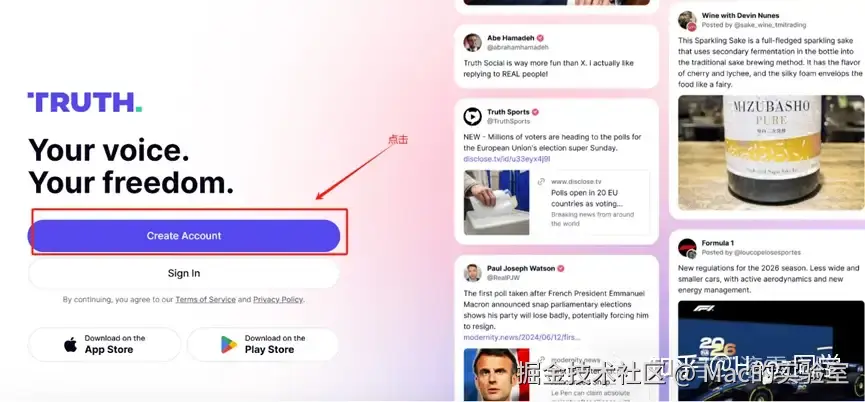打开浏览器,输入Truth Social官网地址,点击“Create Account”按钮开始注册。