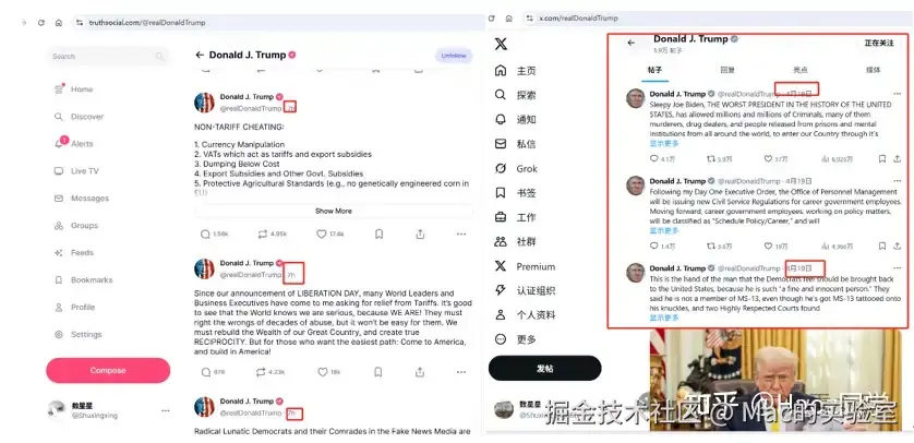 而且从整个“真相”平台上的动态我们可以看到懂王实时发送,而X上偶尔更新(图左一真相,图右一X)。