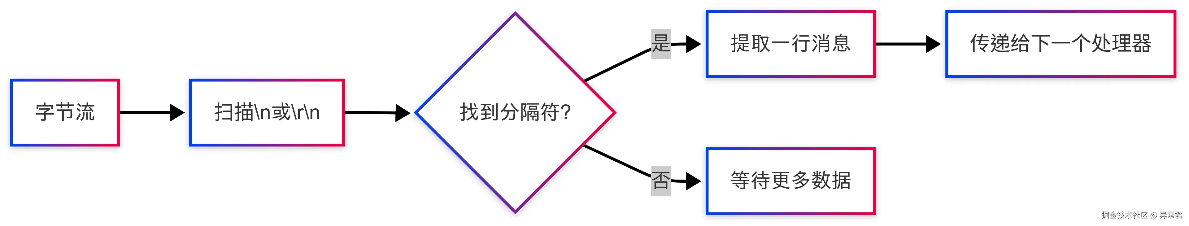 这个解码器使用\n或\r\n作为分隔符,非常适合基于文本的协议,比如聊天应用、日志传输等。