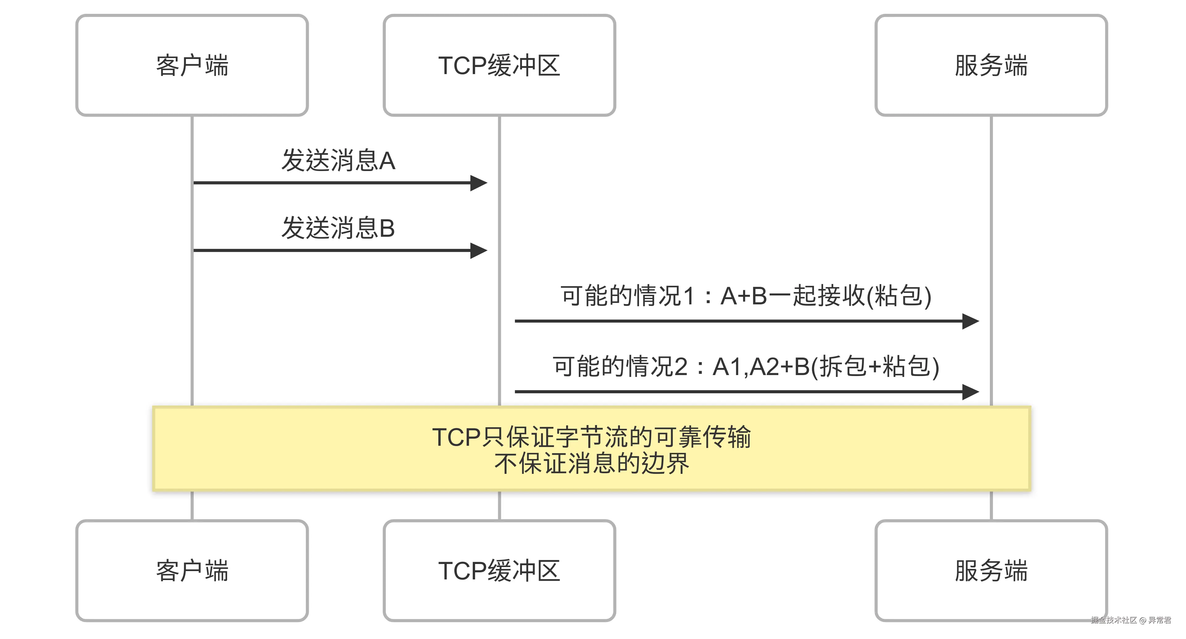 TCP 是流协议:TCP 只关心字节流的传输,不会在数据包之间保留边界信息,就像水管中的水流,你无法区分哪些水是上一秒的,哪些是这一秒的。