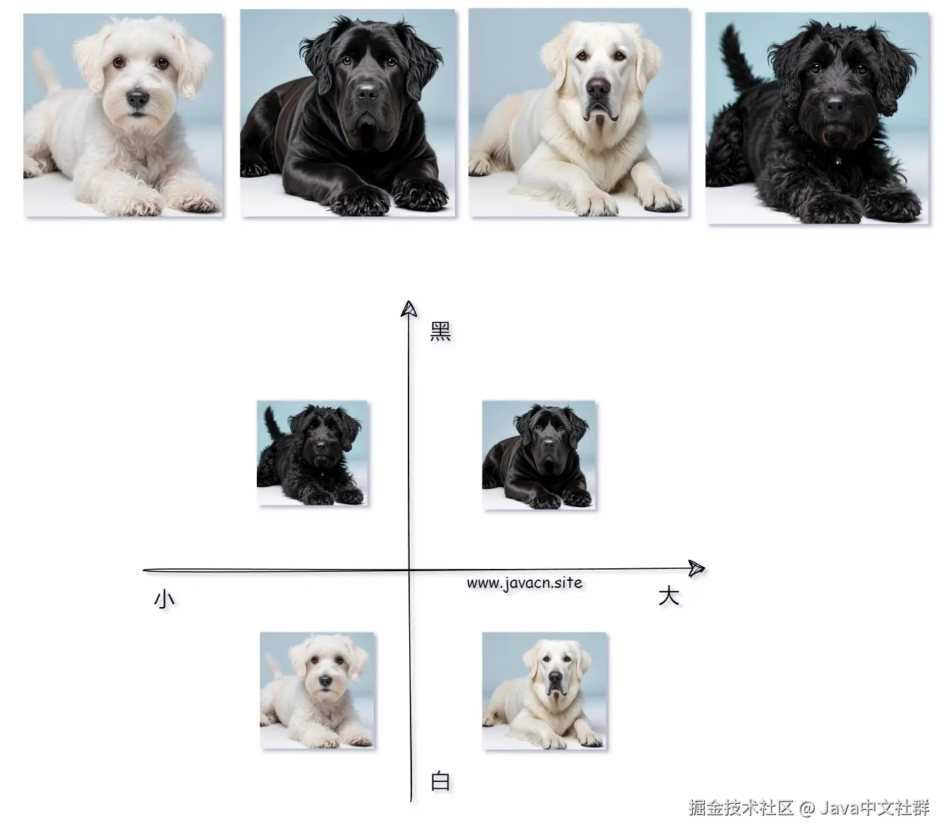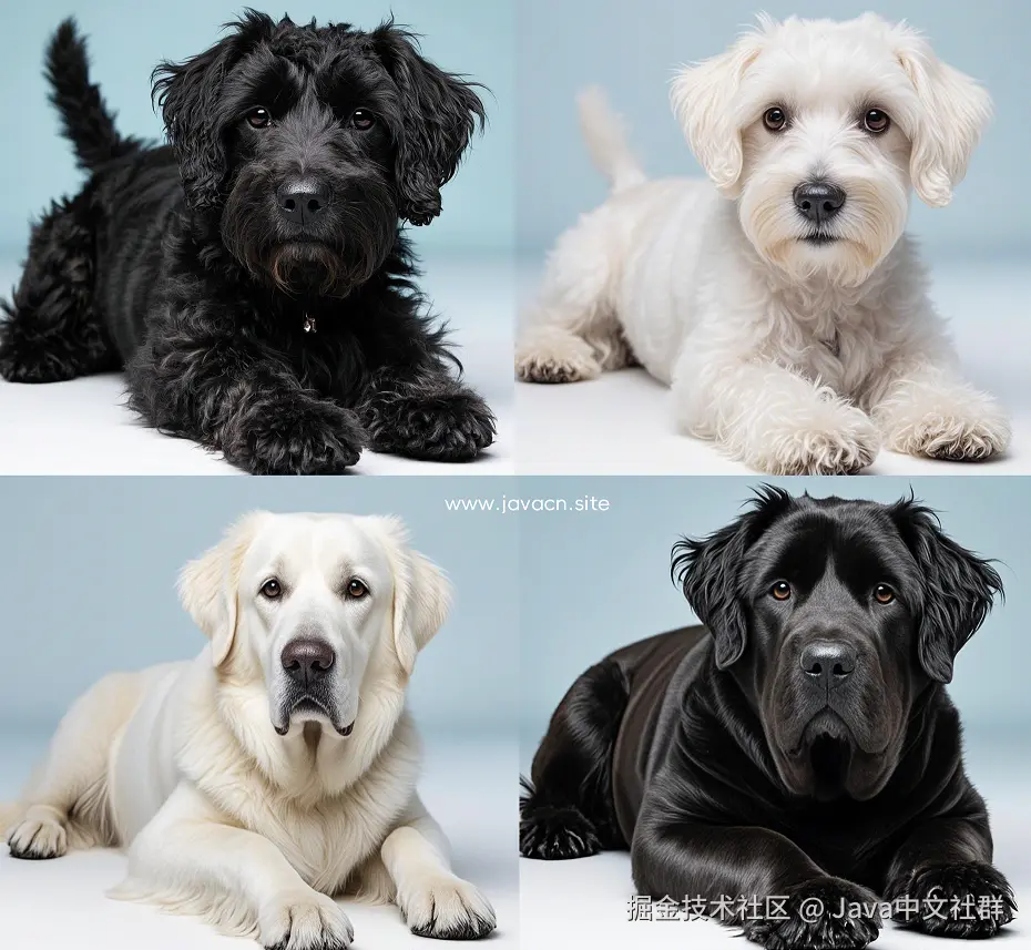 例如,有以下 4 种狗,我们要在大模型中如何表示它们呢: