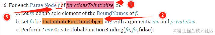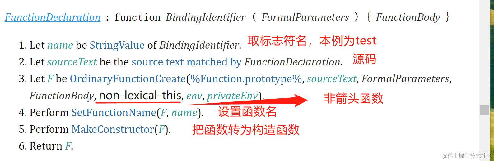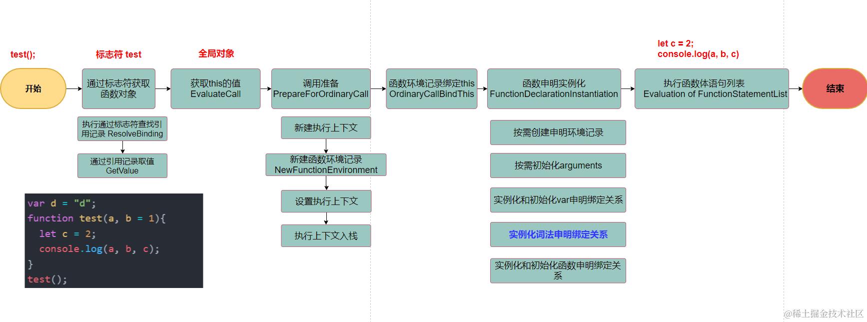 当 test() 执行时,实际是先找 test标志符对应的函数对象,然后评估函数对象属性[[ECMAScriptCode]] 里面的语句列表 FunctionStatementList(等于如下红色圈出部分),协议描述的流程大致如下: