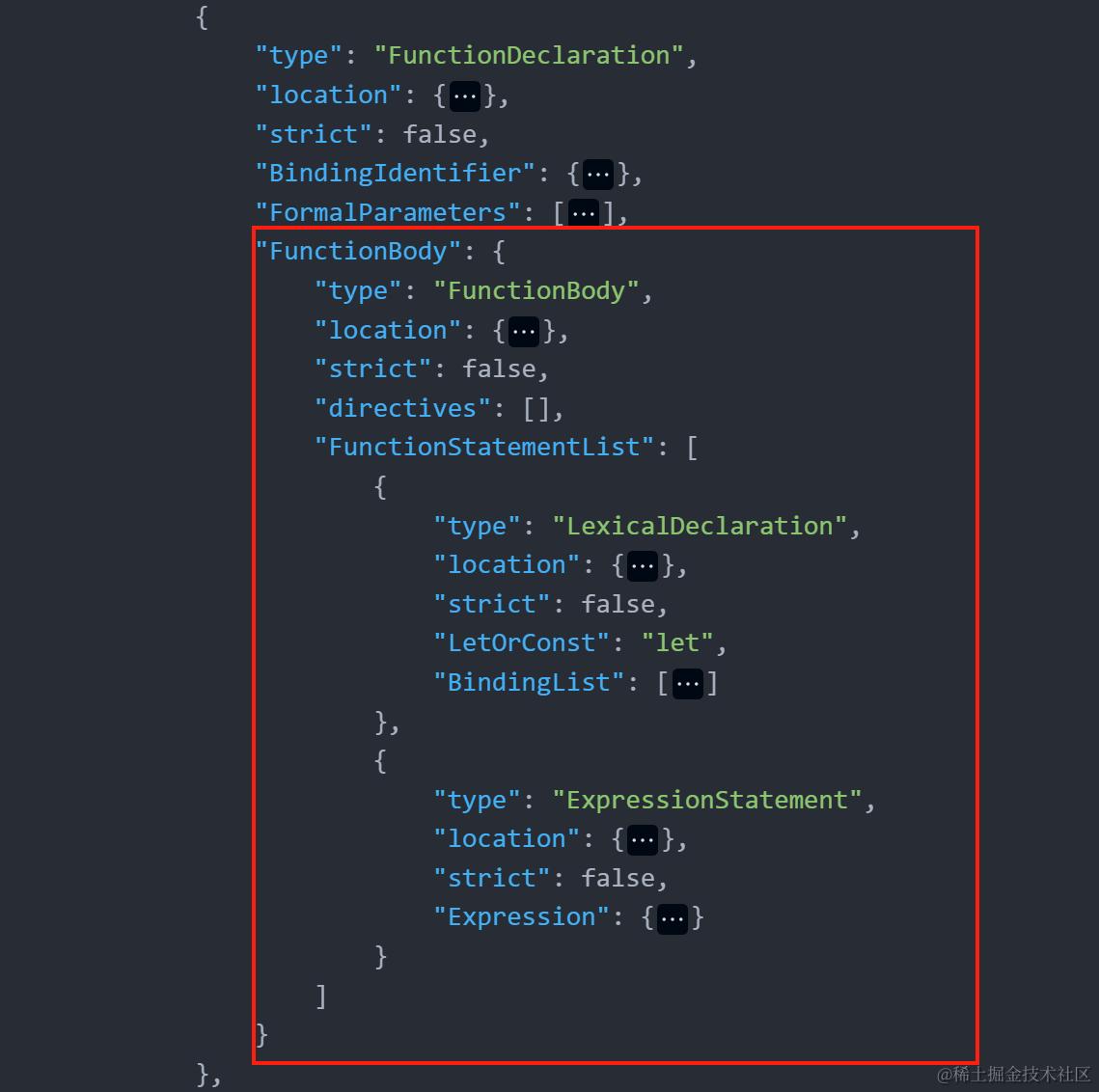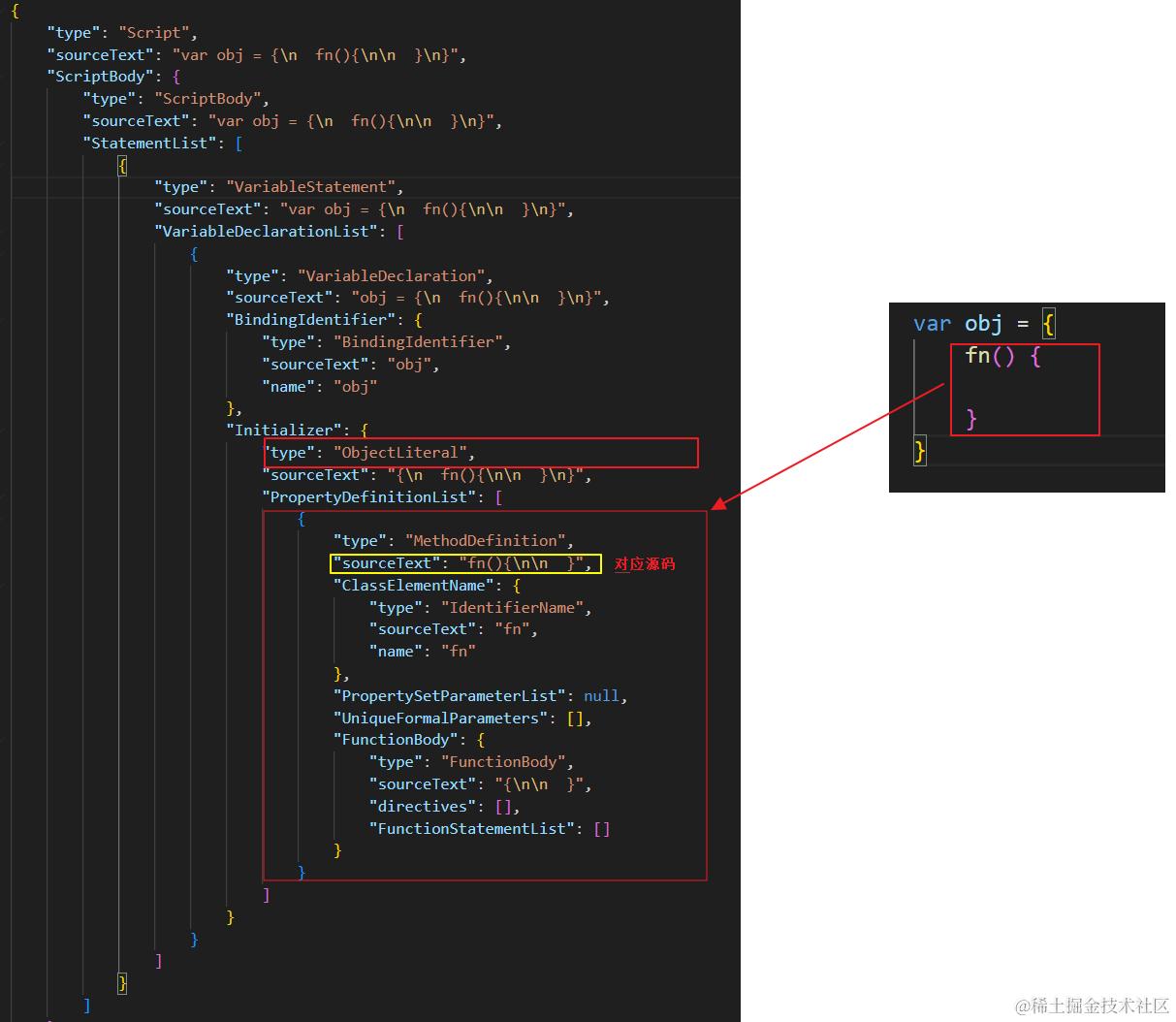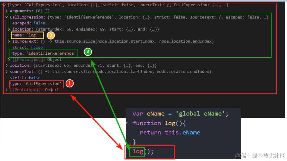 type为CallExpression节点有个叫做 type为IdentifierReference的 CallExpression节点,两个节点对应的源码部分已经用不不同颜色标记。