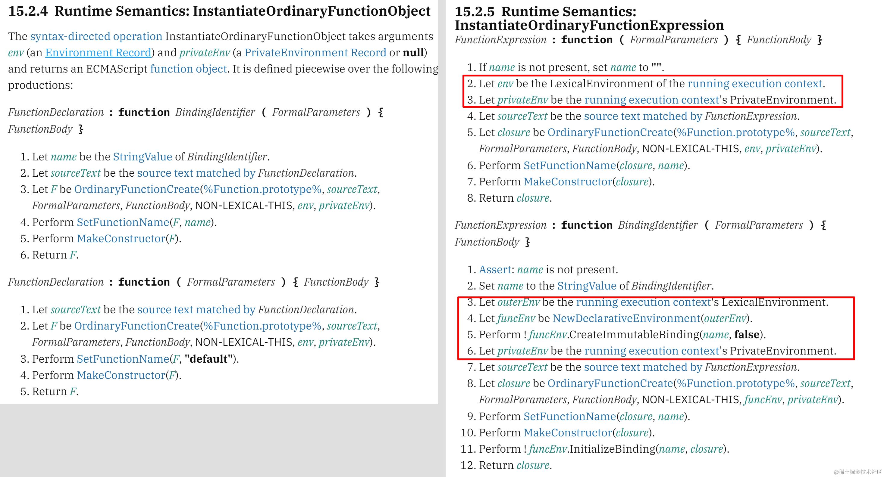 下图与 普通函数表达式的初始化逻辑做了个对比,除了执行上下文和环境记录有区别外,函数本身实例化的逻辑是基本一致的。 至于具名的函数表达式为什么会多一个环境记录,在 闭包 章节有详细的解答。