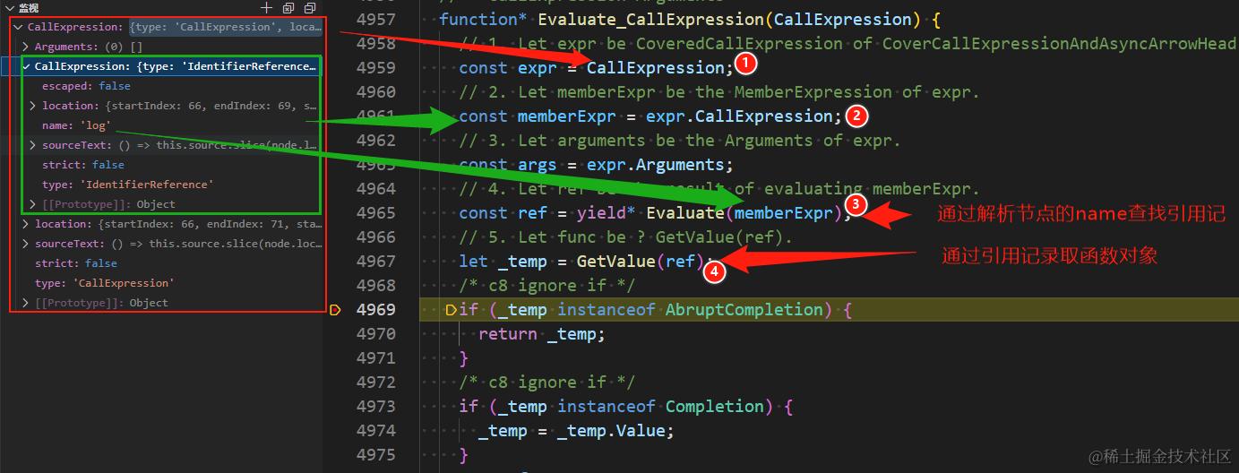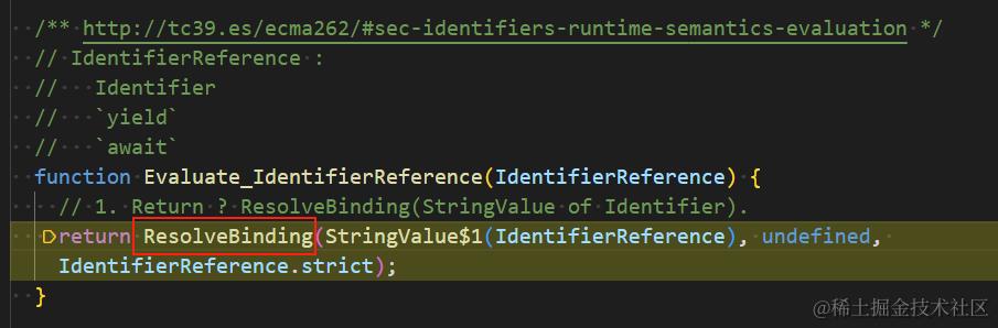 IdentifierReference的CallExpression节点的name属性,能得到函数的标志符 - 上下文用标志符通过 ResolveBinding 查找对应的引用记录