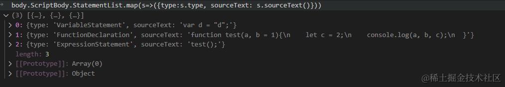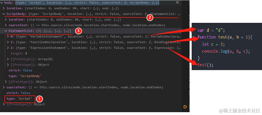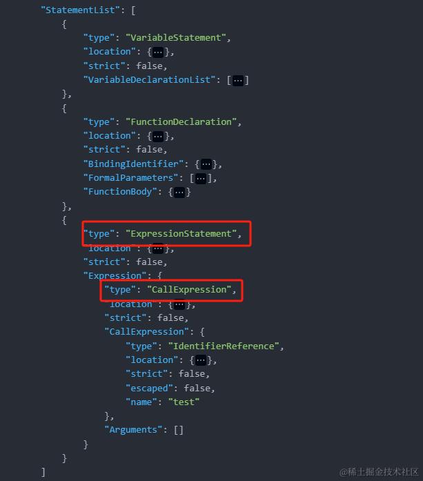 本例中的三个语句中的第三个语句ExpressionStatement, 对应源码 test();。