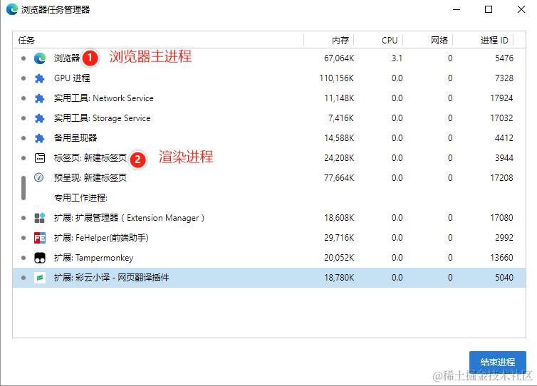 - 怎么查看浏览器有哪些进程呢, 浏览器 更多工具 => 任务管理器