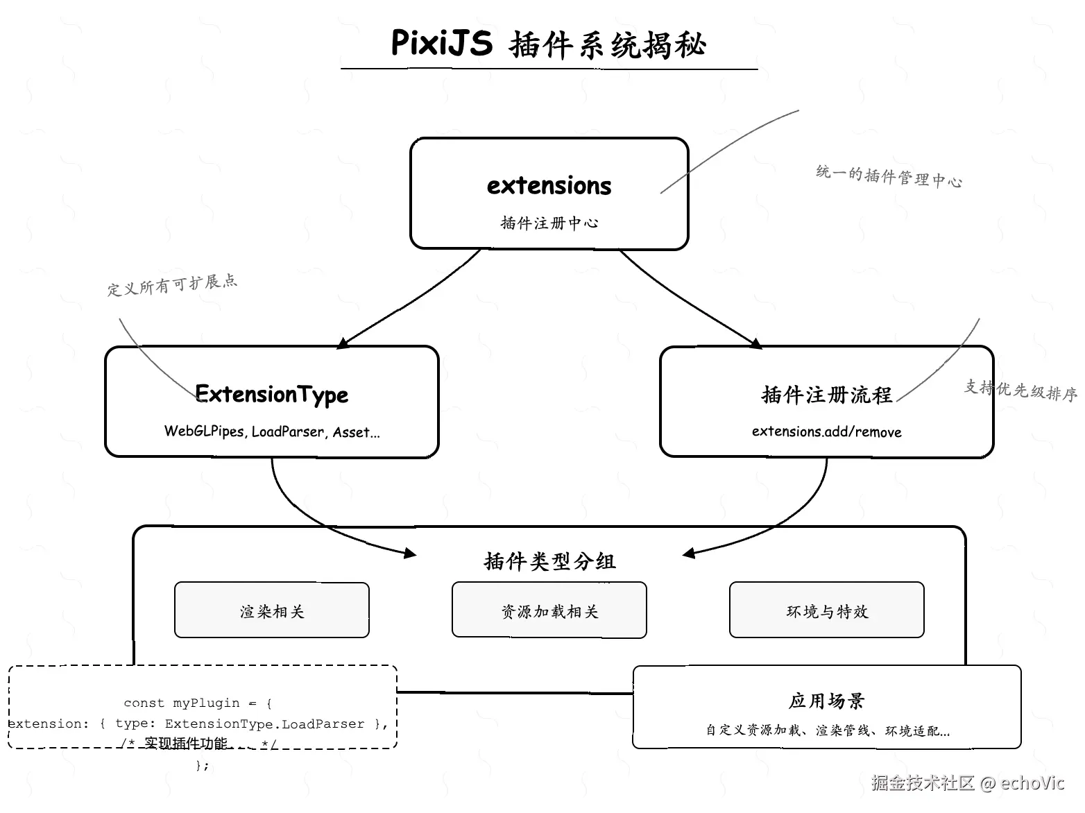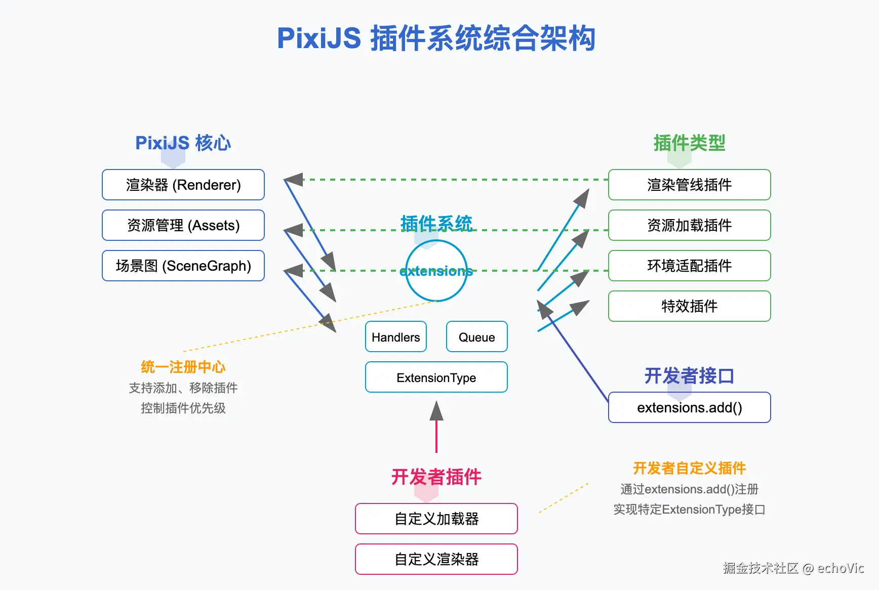 ExtensionType枚举,PixiJS 定义了清晰的插件接口和作用范围,使得插件开发者能够迅速了解每个扩展点的用途和要求,有效降低了集成难度。例如,在开发资源加载插件时,开发者只需关注LoadParser类型的接口规范即可。 - 中心化管理:统一的