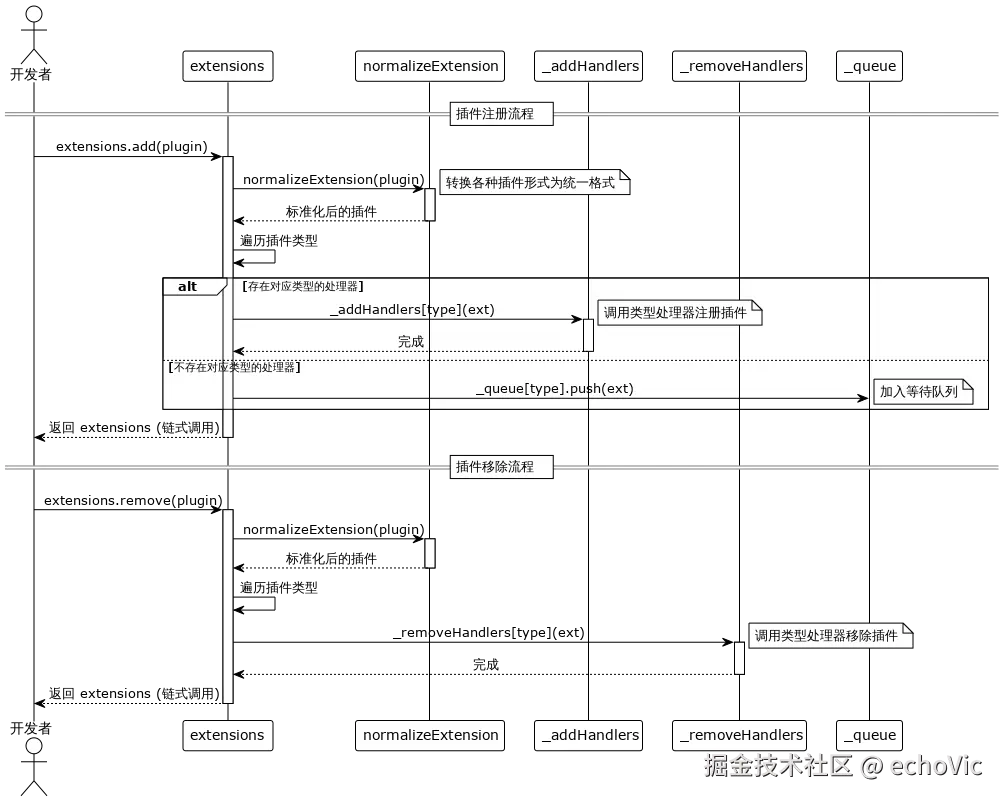 插件的生命周期管理通过 extensions.add() 和 extensions.remove() 方法进行。