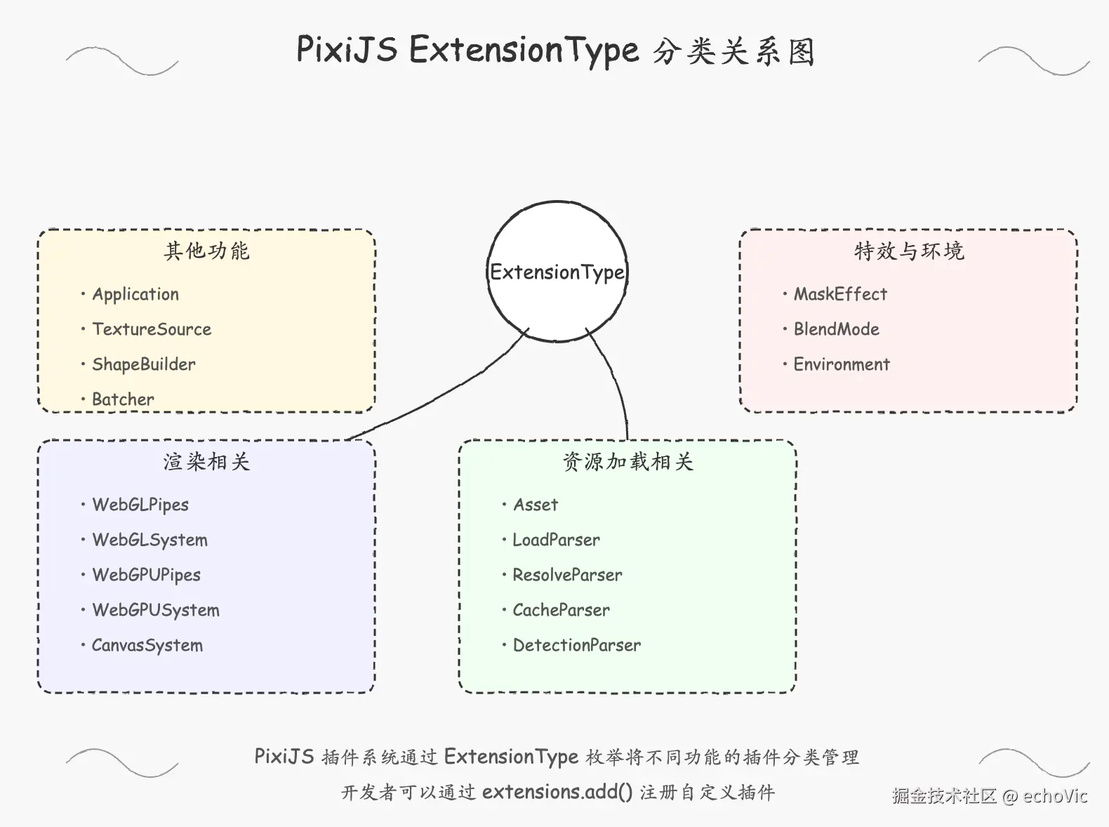 ExtensionType 是理解插件系统的关键。它定义了插件可以介入 PixiJS 核心功能的具体位置。主要类型包括: