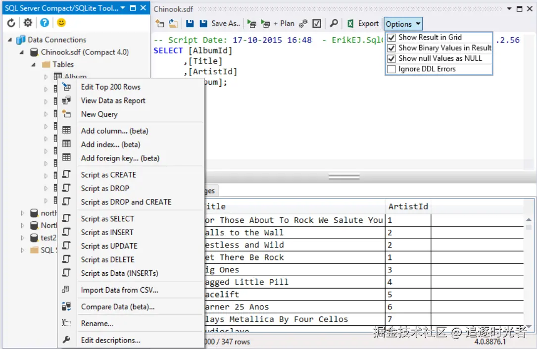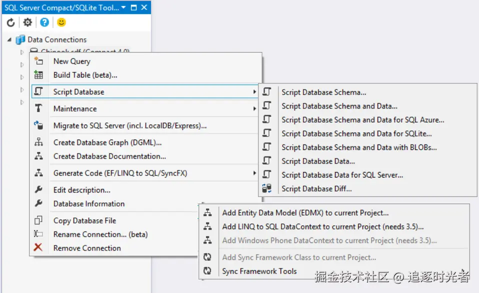 适用于 Visual Studio 的 SQLite / SQL Server Compact 工具箱扩展。此扩展添加了多项功能来帮助您的嵌入式数据库开发工作:表和数据的脚本编写、从 SQL Server 和 CSV 文件导入等等。