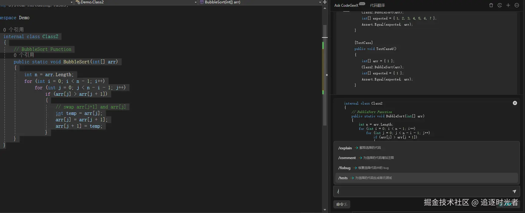 CodeGeeX是一款基于大模型的智能编程助手,它可以实现代码的生成与补全、自动为代码添加注释、自动解释代码、自动编写单元测试、实现代码审查Code Review、自动修复代码fixbug、自动生成commit message完成git提交,以及在不同编程语言的代码间实现互译、针对技术和代码问题的智能问答等丰富的功能(支持Python、Java、C#、C++/C、JavaScript、Go等多种语言)。