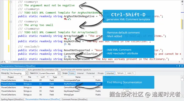 GhostDoc 是一个 Visual Studio 扩展,适用于需要使用可自定义模板从源代码生成 XML 注释、维护干净且最新的文档、生成多种格式的帮助文档、使用 Visual Studio 中的智能源代码拼写检查器等的开发人员。