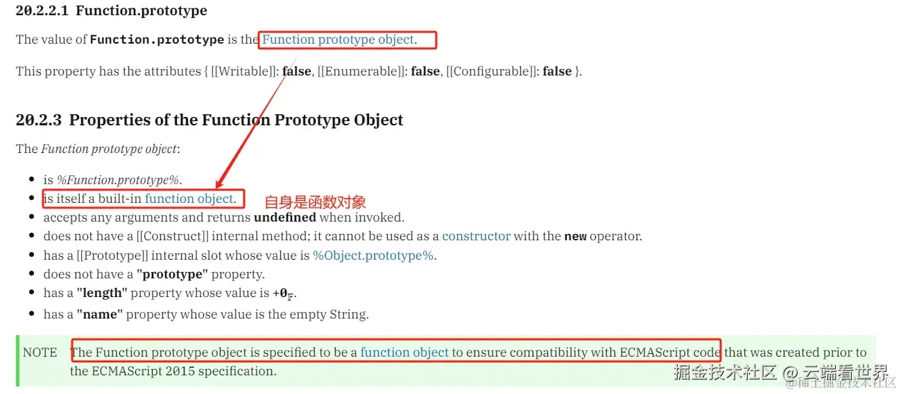 最后一行:函数原型对象被指定为一个函数对象,以确保与在ECMAScript 2015规范之前创建的ECMAScript代码兼容。