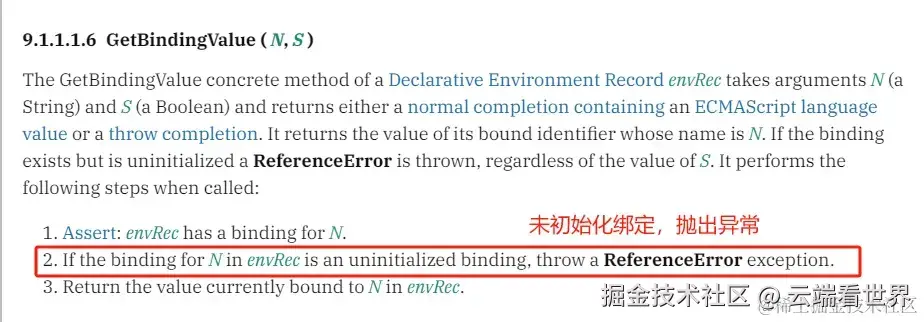 取值行为过程会进行判断,如果申明未初始化,就会抛出 ReferenceError。