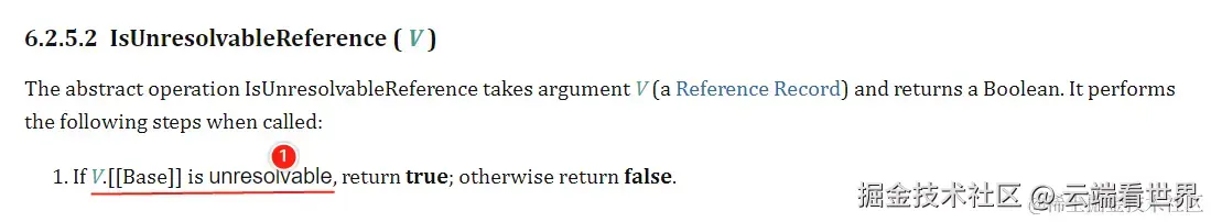 这个概念已经提了很多次了,本章节只要重点关注其[[Base]]字段, 有个特殊的值就是 unresolvable,和他关联紧密有一个方法为 IsUnresolvableReference ( V ), 其主要就是判断引用可达不可以,其一种表现就是变量申明没有。