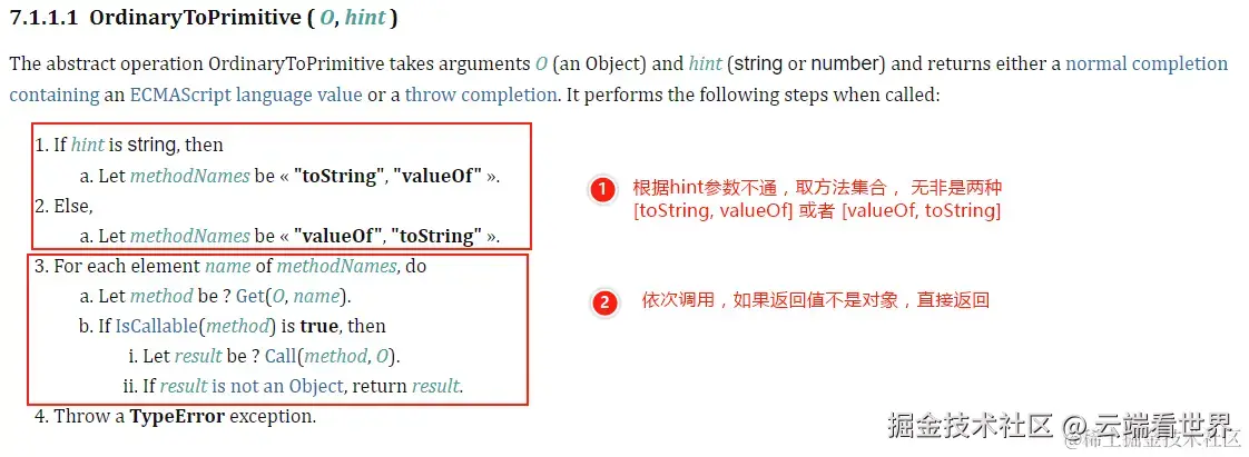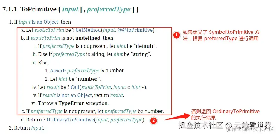 别看上面第一步写了那么多,其就是调用定义的Symbol.toPrimitive方法。 原值转为不是本节的重点,你只需要知道 object的实例和原型上默认是没有这个方法的, 就会走后面的逻辑。