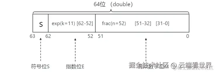 以双精度浮点数(64位)为例,这64位 又分为 符号位, 指数位,和尾数位(图中的有效数字位)。