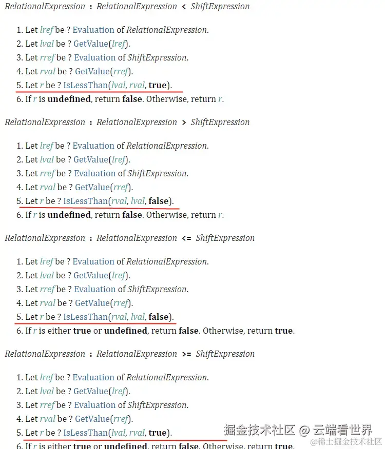 | lVal < rVal | IsLessThan(lVal, rVal, true) | 特殊情况返回undefined 原值lVal < 原值rVal ? true: false | r === undefined ? false: true | ||