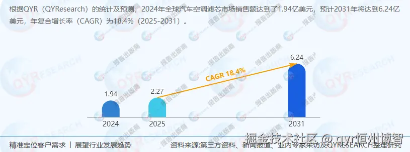 本报告基于QYResearch的统计及预测数据,深入分析了全球及中国汽车空调滤芯市场的现状、供应链结构、主要生产商、市场趋势及未来发展方向。报告指出,2024年全球汽车空调滤芯市场销售额达到1.94亿美元,预计到2031年将增长至6.24亿美元,年复合增长率(CAGR)为18.4%(2025-2031)。中国市场作为全球重要的汽车生产与消费市场,其汽车空调滤芯市场亦展现出强劲的增长潜力。