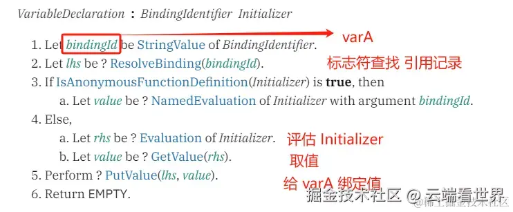 答:静态语义分析时就确定了。 各种申明绑定关系,申明实例化时创建的,var申明和函数申明在此阶段有初始化,var申明统一为undefined, 而 函数申明则为函数对象。let/const/class的初始化都是运行时(代码执行时)行为。 初始化是通过评估Initializer节点而得到的值。 - 下面的