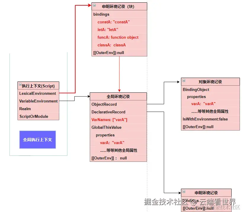 当 varA = 'varA'这段代码走完,也是 这个节点解析完毕,全局环境环境记录上的 对象环境记录 上的