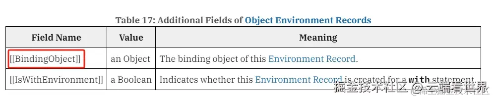 | Object Environment Record | 对象环境记录。with 和 和全局代码执行时会创建。 | 绑定with 或者 全局环境记录标志符 |