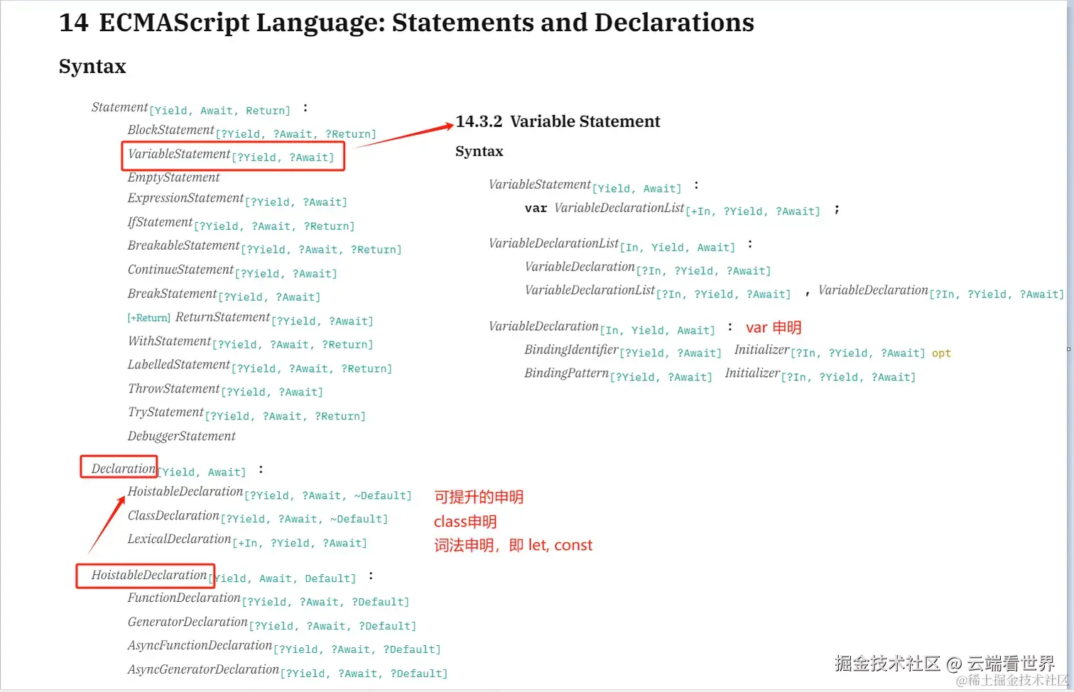 | VariableStatement var 申明 | HoistableDeclaration 可提升的申明(函数) | ClassDeclaration class申明 | LexicalDeclaration let/const申明 | |