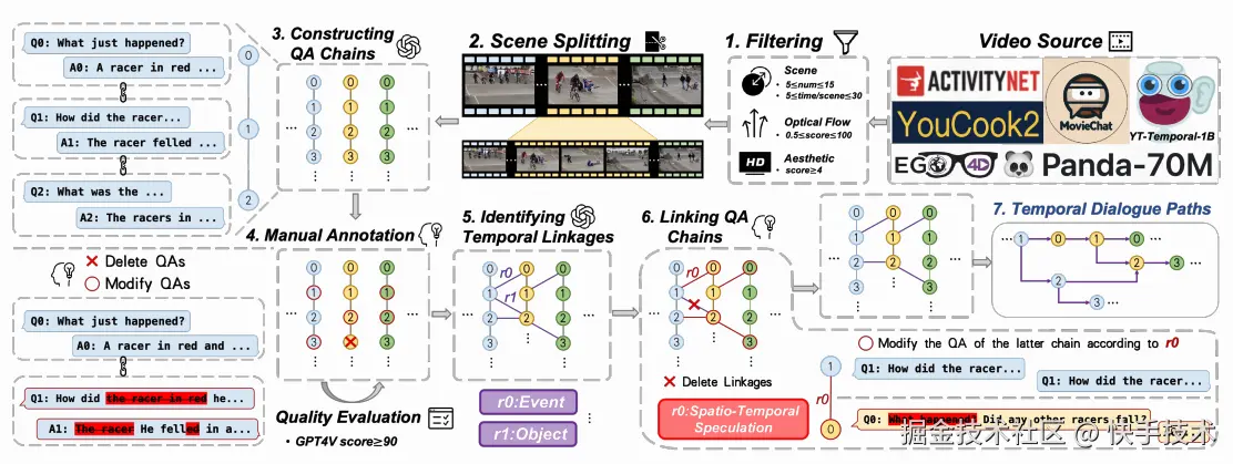 为弥补这些缺陷,我们提出了一个具有时序多轮问答链的开拓性基准 SVBench,专门用于全面评估当前 LVLMs 在流媒体视频理解中的能力。我们设计了半自动化标注流程,从 1,353 个流媒体视频中构建了 49,979 个问答对,包括生成代表视频片段连续多轮对话的问答链,以及在连续问答链间建立时序关联。通过对 14 个模型进行对话式评估和流式评估的实验结果表明,虽然闭源的 GPT-4o 模型表现最优,但大多数开源 LVLMs 在长上下文流媒体视频理解方面仍面临挑战。我们还构建了 StreamingChat 模型,该模型在 SVBench 上显著超越开源 LVLMs,并在多样化视觉语言基准测试中达到可比性能。我们期望 SVBench 能够通过提供对当前 LVLMs 的全面深入分析,推动流媒体视频理解领域的研究进展。