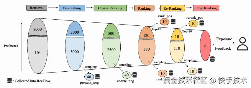 为弥合离线推荐基准与真实在线环境间的鸿沟,我们推出首个工业级全流程推荐数据集 RecFlow。与现有数据集不同,RecFlow 不仅包含曝光空间样本,还涵盖推荐漏斗中各阶段被过滤的未曝光样本。该数据集包含:基于 42,000 用户对近 900 万项目的 3,800 万次交互数据,以及通过 930 万次在线请求在 37 天内收集的横跨 6 个流程阶段的 19 亿阶段样本。基于 RecFlow,我们开展探索实验验证其在推荐算法创新中的潜力:引入各阶段的未曝光样本可显著提升算法效果。部分算法已在快手平台上线并持续产生显著收益。我们发布 RecFlow 作为推荐领域首个完整的全流程基准数据集,支持以下研究方向:全流程算法设计(包括选择偏差研究、去偏算法、多阶段一致性与最优性)、多任务推荐及用户行为建模。