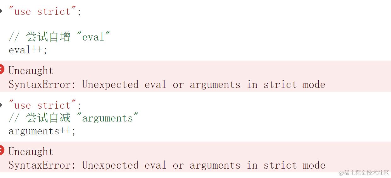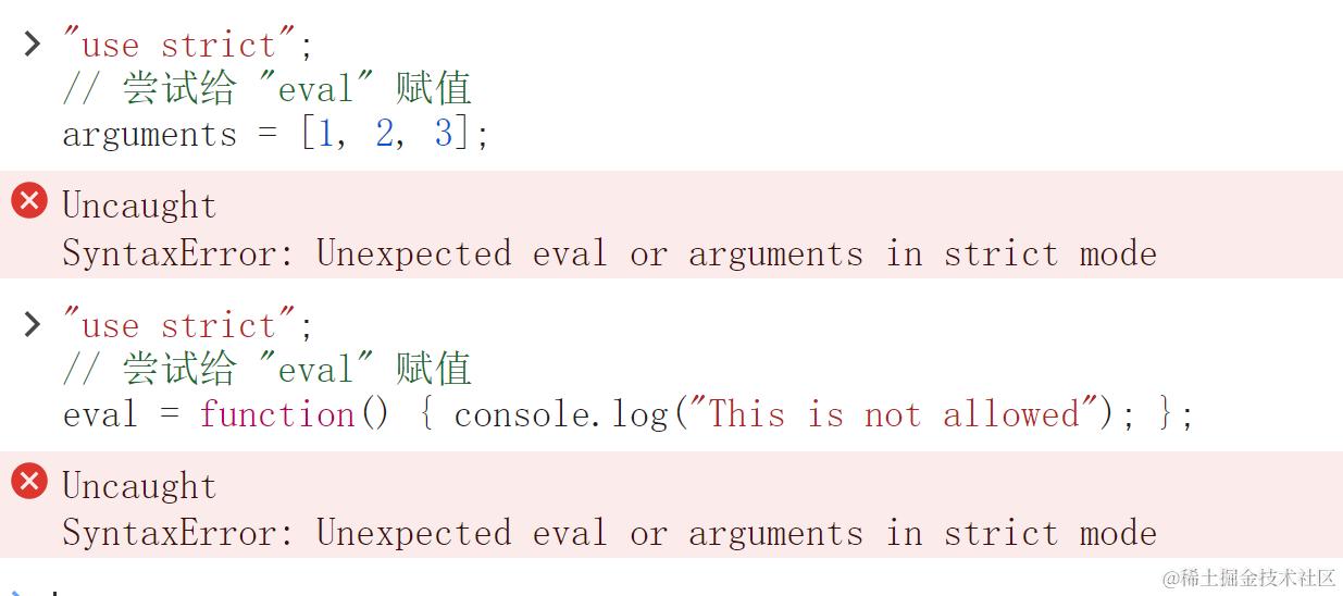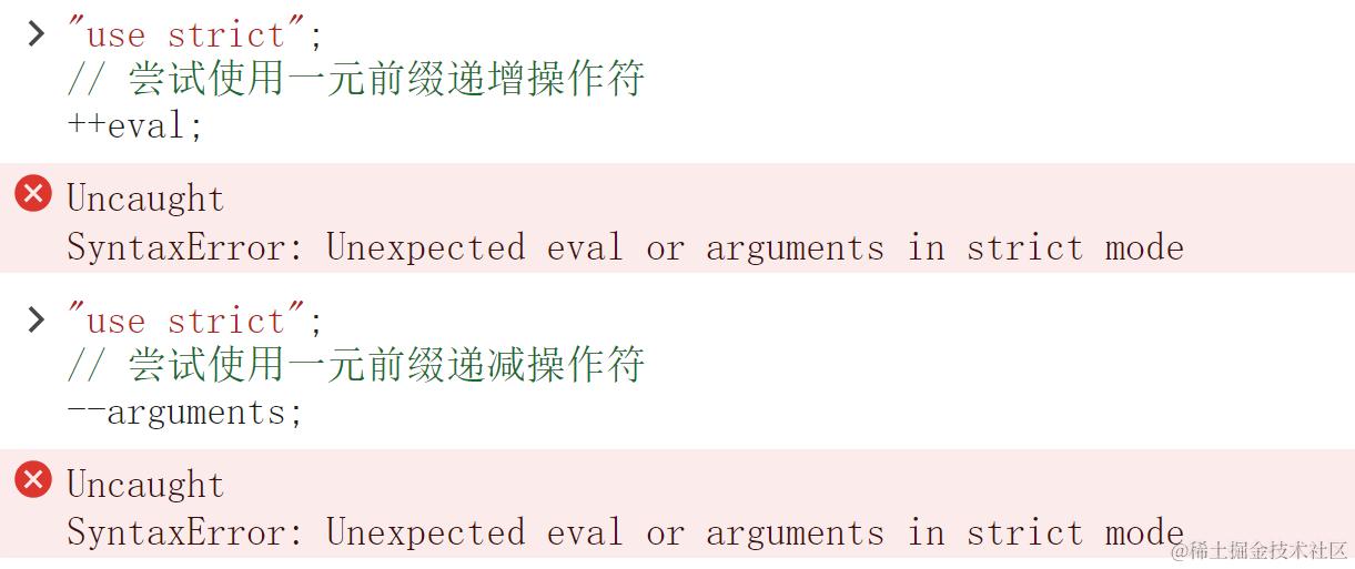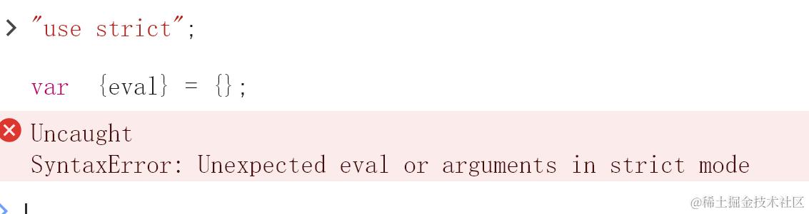 } catch ({eval, arguments}) { // 同样,使用arguments作为CatchParameter也会导致SyntaxError