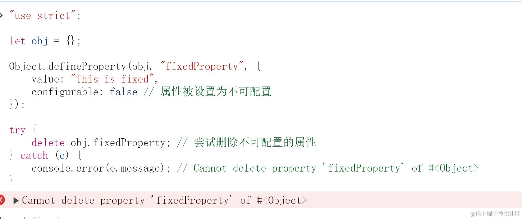 delete obj.fixedProperty; // 尝试删除不可配置的属性