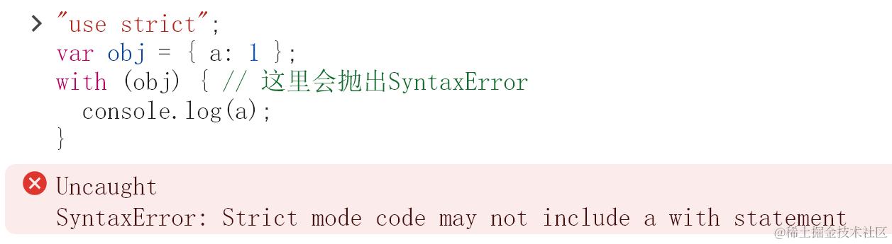 在的严格模式下,代码不允许包含WithStatement。如果在严格模式的上下文中出现了WithStatement,将引发一个SyntaxError。这一规定在ECMAScript规范的14.11.1节中有明确阐述。
