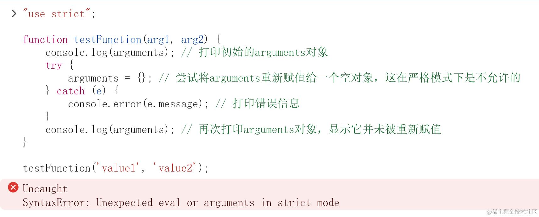 arguments = {}; // 这里尝试修改arguments标识符会抛出错误,因为是严格模式