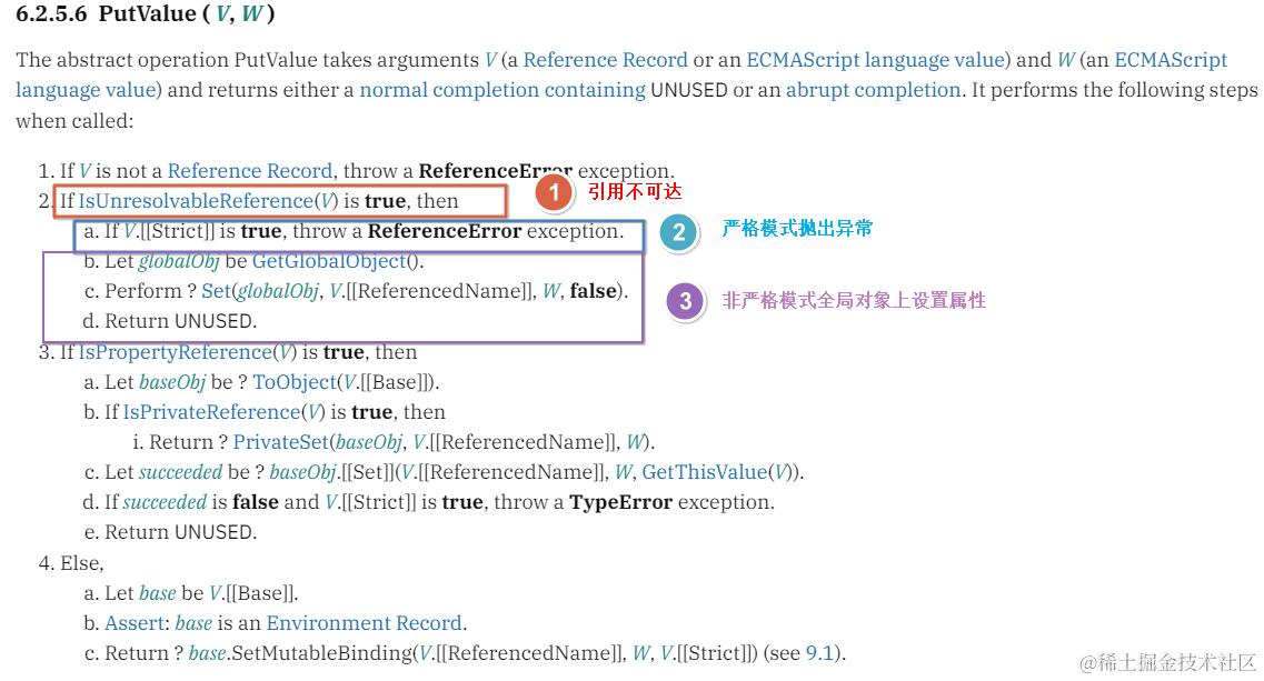 严格模式下,对未声明的标识符或者其他无法解析的引用进行赋值操作时,不会自动在全局对象上创建相应的属性。具体来说,当在严格模式代码中执行简单的赋值操作时,赋值语句左侧(LeftHandSideExpression)不能引用一个无法解析的引用。如果发生这种情况,将会抛出一个ReferenceError异常(根据6.2.5.6章节的规定)。