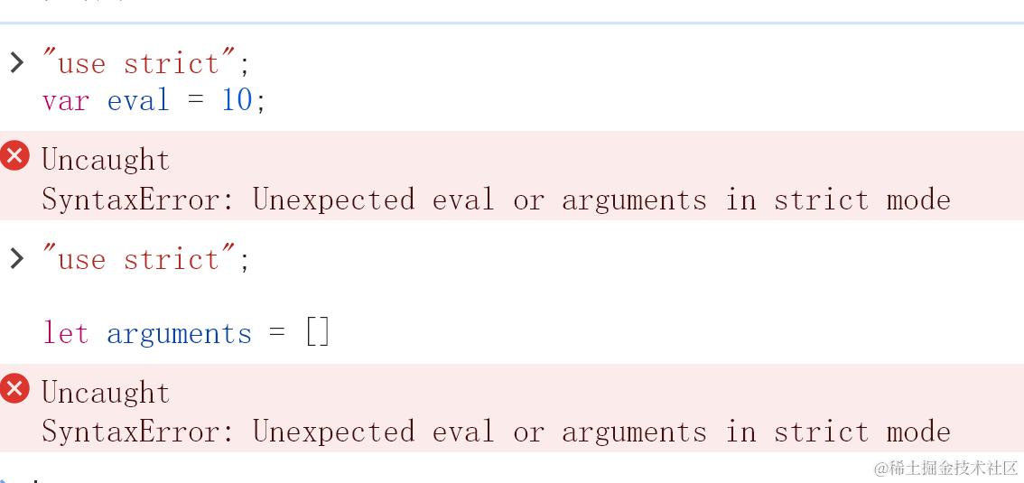 - arguments对象: 直接修改arguments标识符是不允许的,但是arguments对象本身仍然可用,用于访问函数的实参。