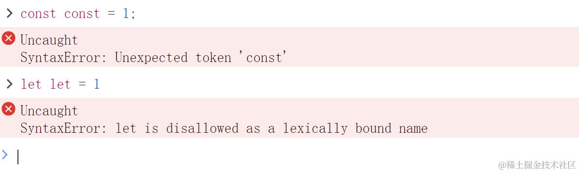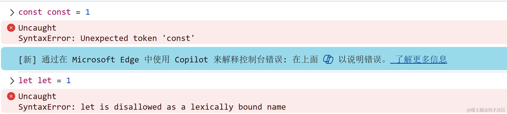 但是在现代浏览器,比如最新的edge和chrome , 实际上 let 和 const 做变量名都是会报错的。
