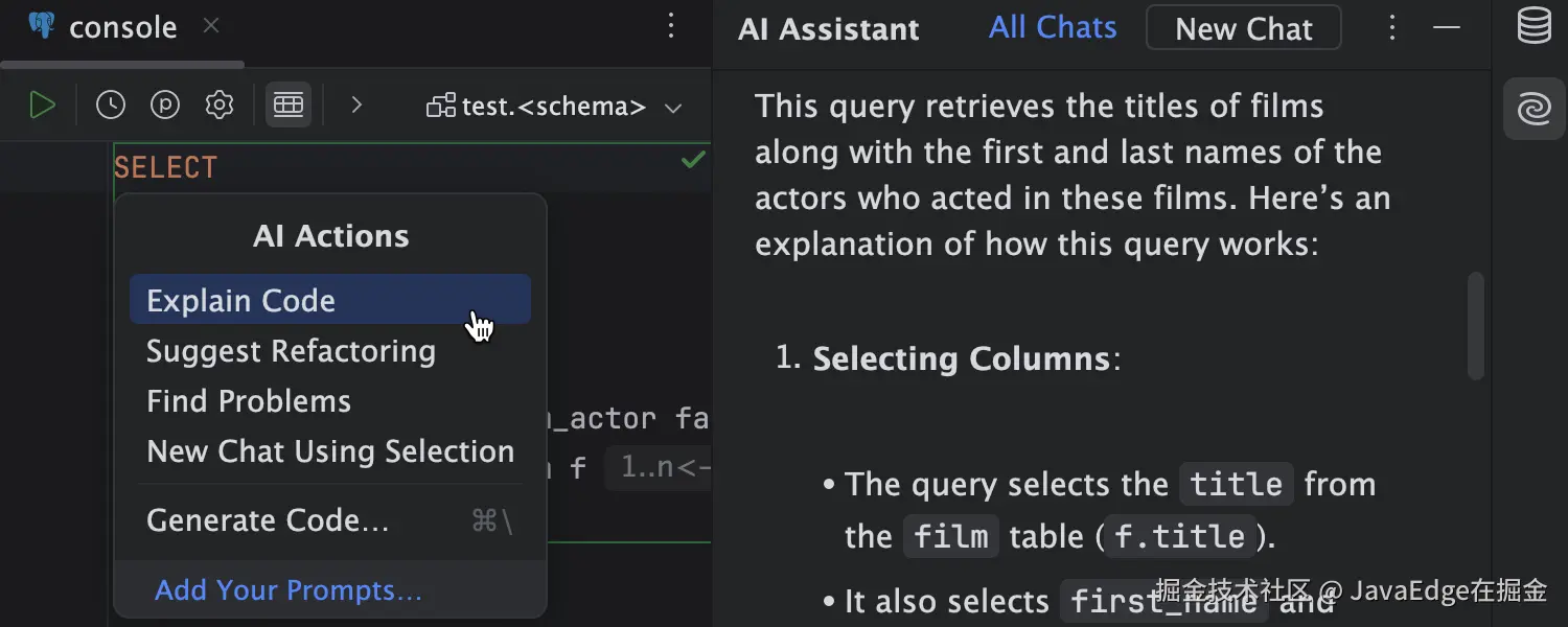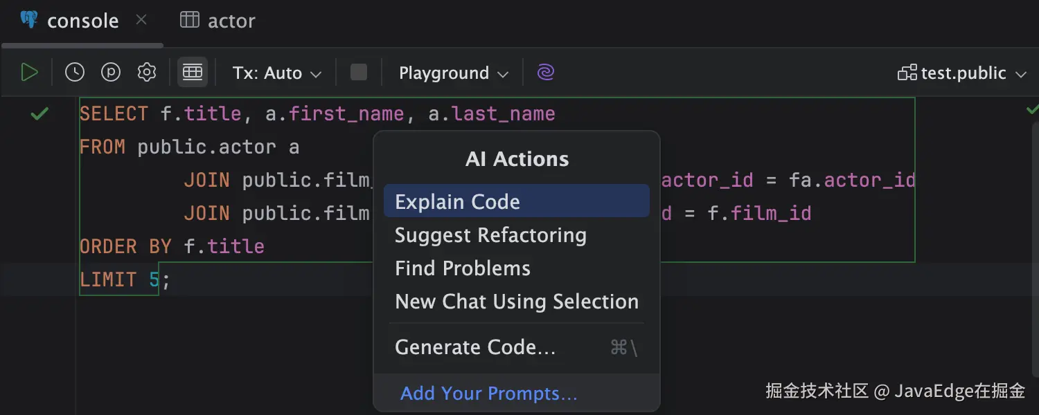 要调用 AI prompt列表,右键单击 SQL 语句,从上下文菜单中选择 AI 操作 ,选择要执行操作: