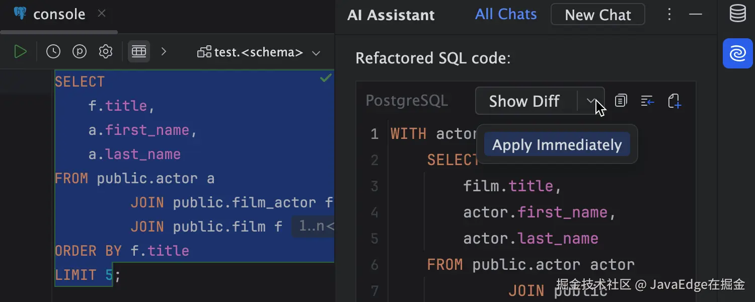 一旦 AI Assistant 生成所请求的代码,会在对话框的预览窗格中查看它,然后接受建议。所有这些 AI Assistant功能可以大大提高您使用数据库工具时的工作效率。