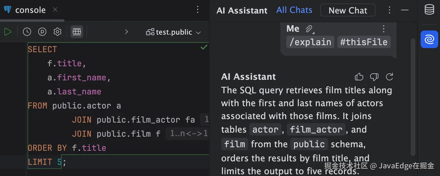 在聊天中,还可指示 AI Assistant比较两个表的 DDL,以获得详细的响应,突出显示表结构之间的差异。在我们的示例中,我们使用以下提示:“比较 actor 表和 film_actor 表的 DDL”。